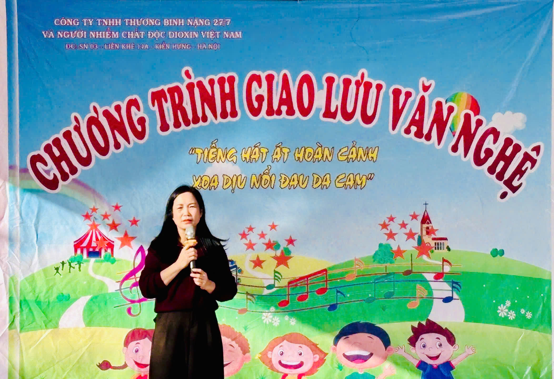 Tại đây, các em được giao lưu văn hóa nghệ thuật với các anh chị của Công ty TNHH thương binh nặng 27/7 và người nhiễm chất độc DIOXIN Việt Nam với chủ đề: “Tiếng hát át hoàn cảnh-xoa dịu nỗi đau da cam.”.