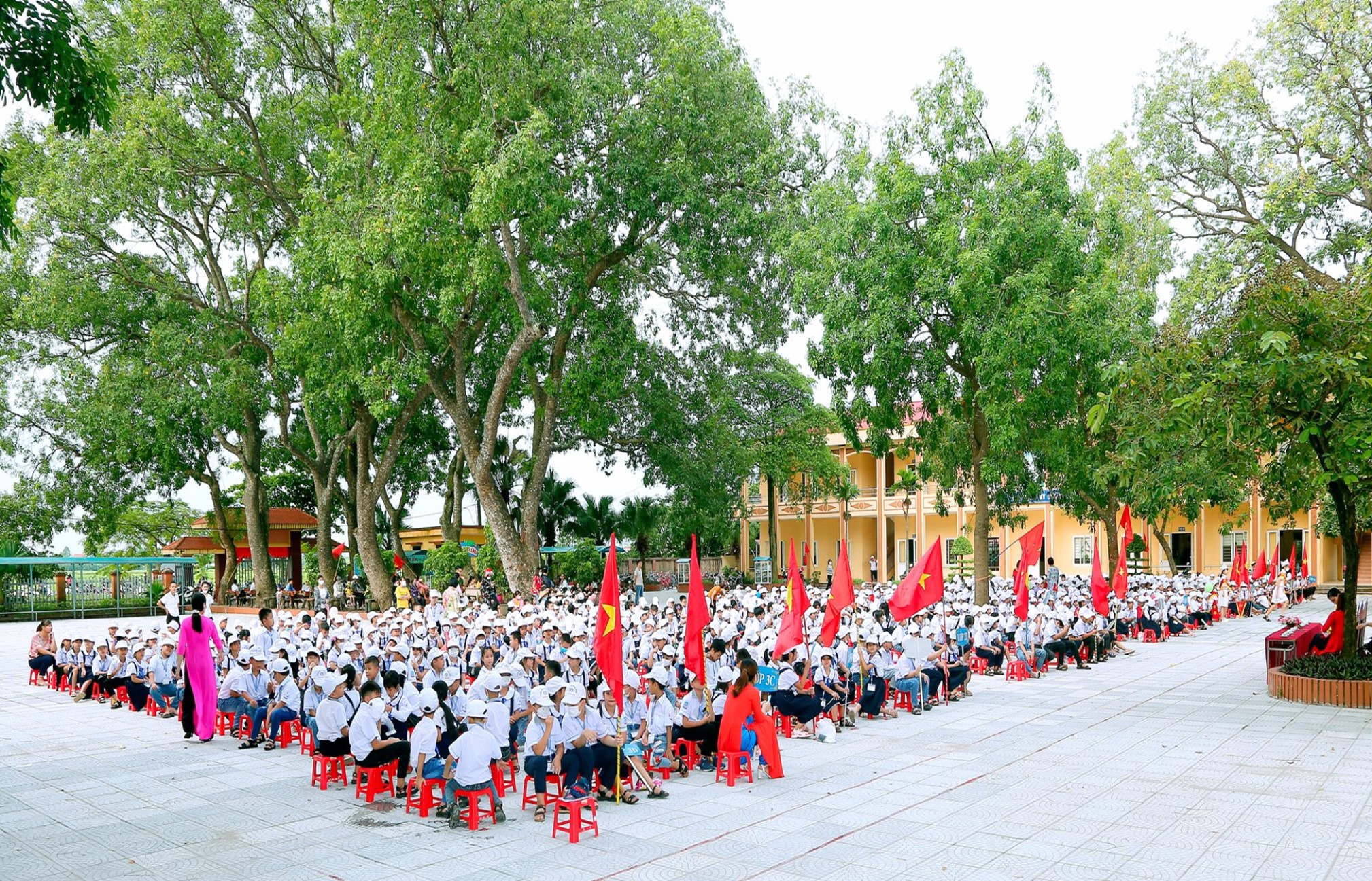 Bước qua cổng trường, hai hàng cây xà cừ già rợp bóng mát như dang tay chào đón, dẫn lối vào dãy phòng học hai tầng khang trang, bề thế. Những cây bàng cổ thụ, phượng vĩ, bằng lăng… tỏa bóng mát quanh sân trường, vừa che nắng che mưa, vừa âm thầm giáo dục các em tình yêu thiên nhiên, ý thức bảo vệ môi trường, giữ gìn trường lớp xanh – sạch – đẹp. Các thảm cỏ xanh mướt, bồn hoa rực rỡ, cây cảnh được chăm sóc tỉ mỉ mỗi ngày, tạo nên một không gian sư phạm hài hòa, tràn đầy sức sống.