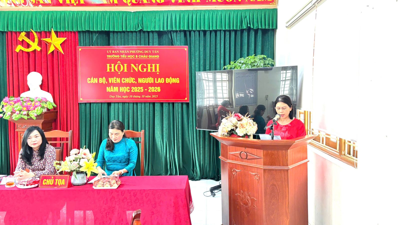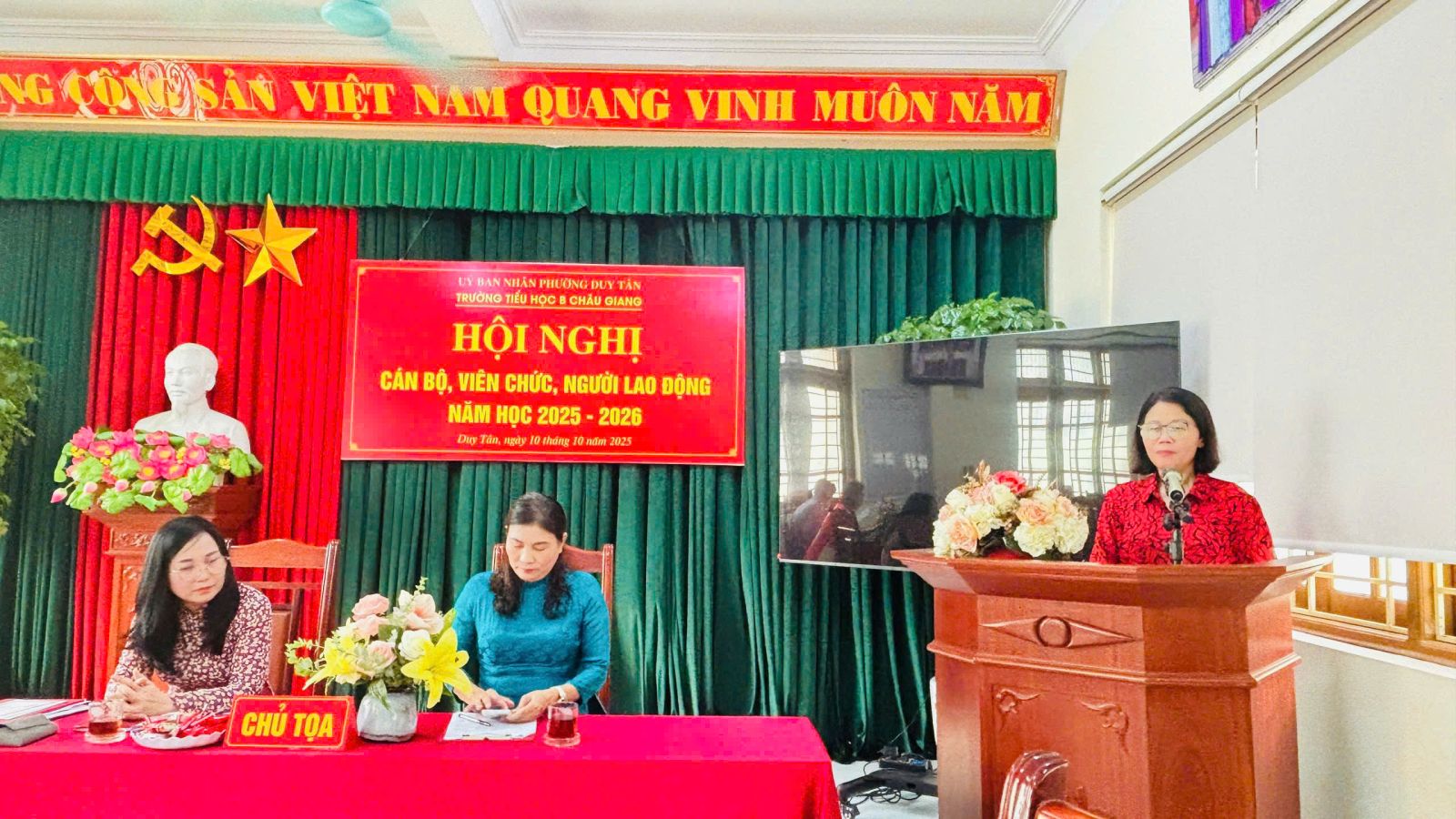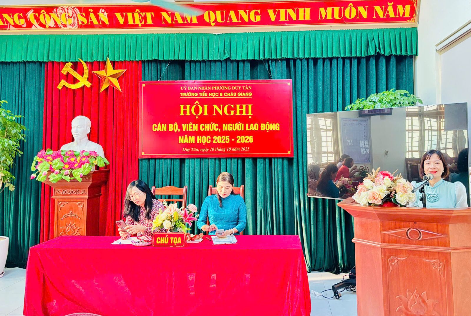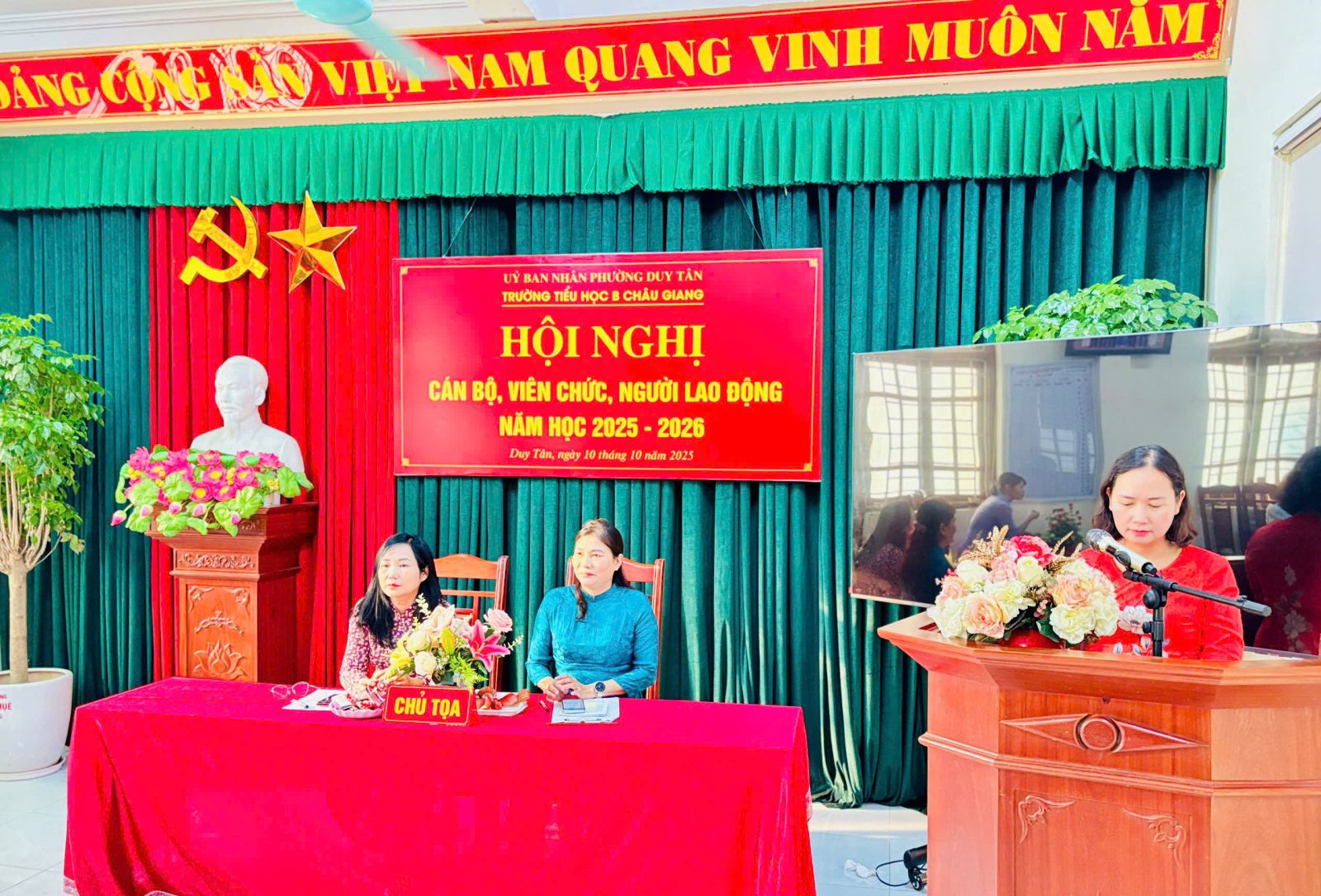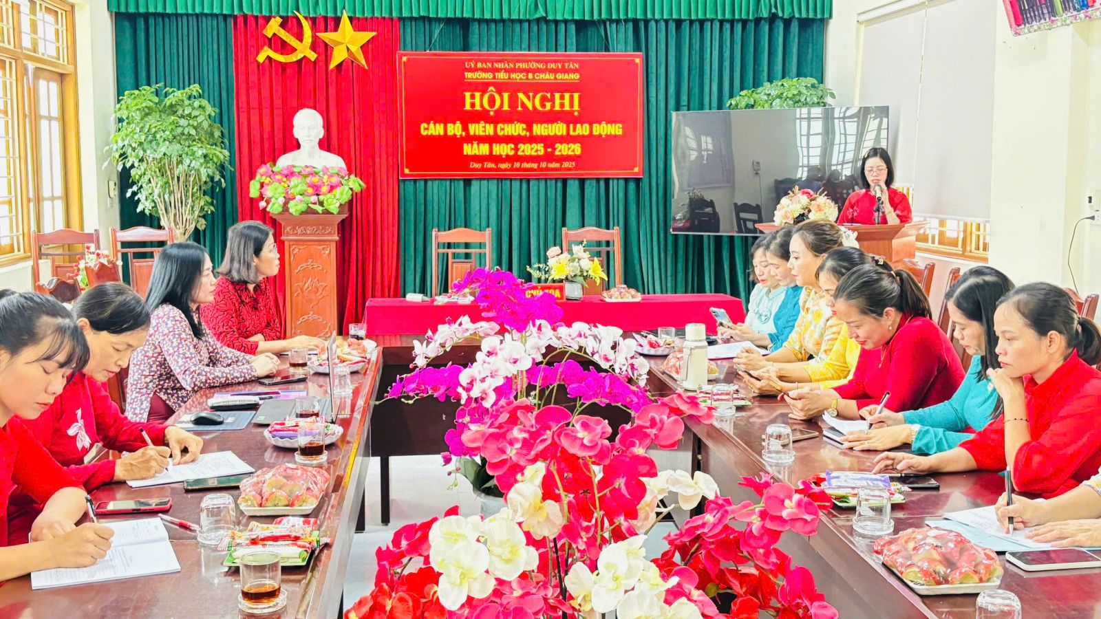 Thực hiện hướng dẫn, chỉ đạo của Sở GD&ĐT tỉnh Ninh Bình; Phòng VH-XH phường Duy Tân. Chiều ngày 10 tháng 10 năm 2025, trường Tiểu học B Châu Giang tổ chức Hội nghị cán bộ, viên chức nhằm phát huy quyền làm chủ thực sự và năng lực sáng tạo của cán bộ, giáo viên, nhân viên trong quá trình thực hiện nhiệm vụ của nhà trường.