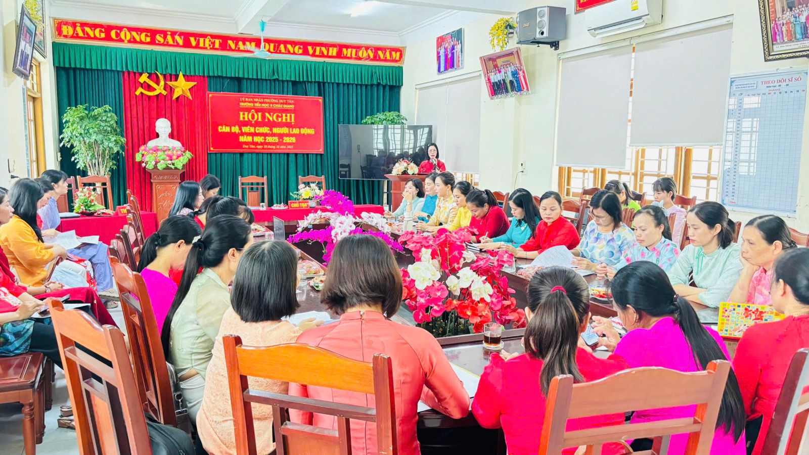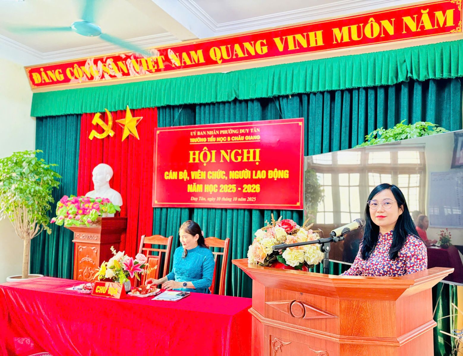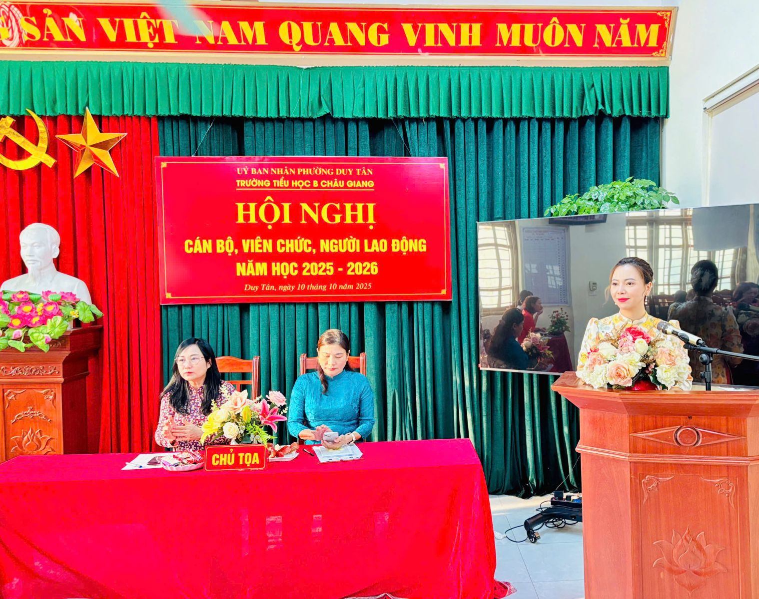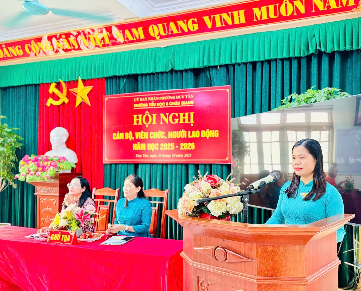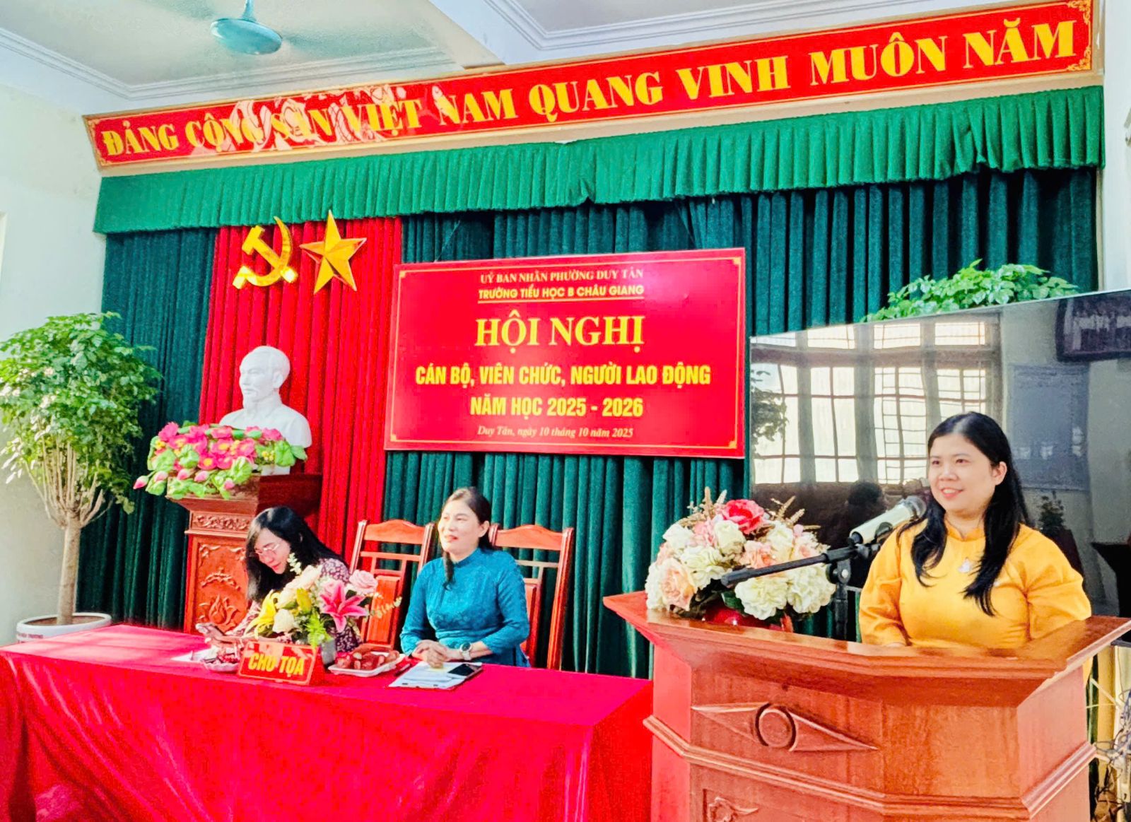 Thực hiện hướng dẫn, chỉ đạo của Sở GD&ĐT tỉnh Ninh Bình; Phòng VH-XH phường Duy Tân. Chiều ngày 10 tháng 10 năm 2025, trường Tiểu học B Châu Giang tổ chức Hội nghị cán bộ, viên chức nhằm phát huy quyền làm chủ thực sự và năng lực sáng tạo của cán bộ, giáo viên, nhân viên trong quá trình thực hiện nhiệm vụ của nhà trường.