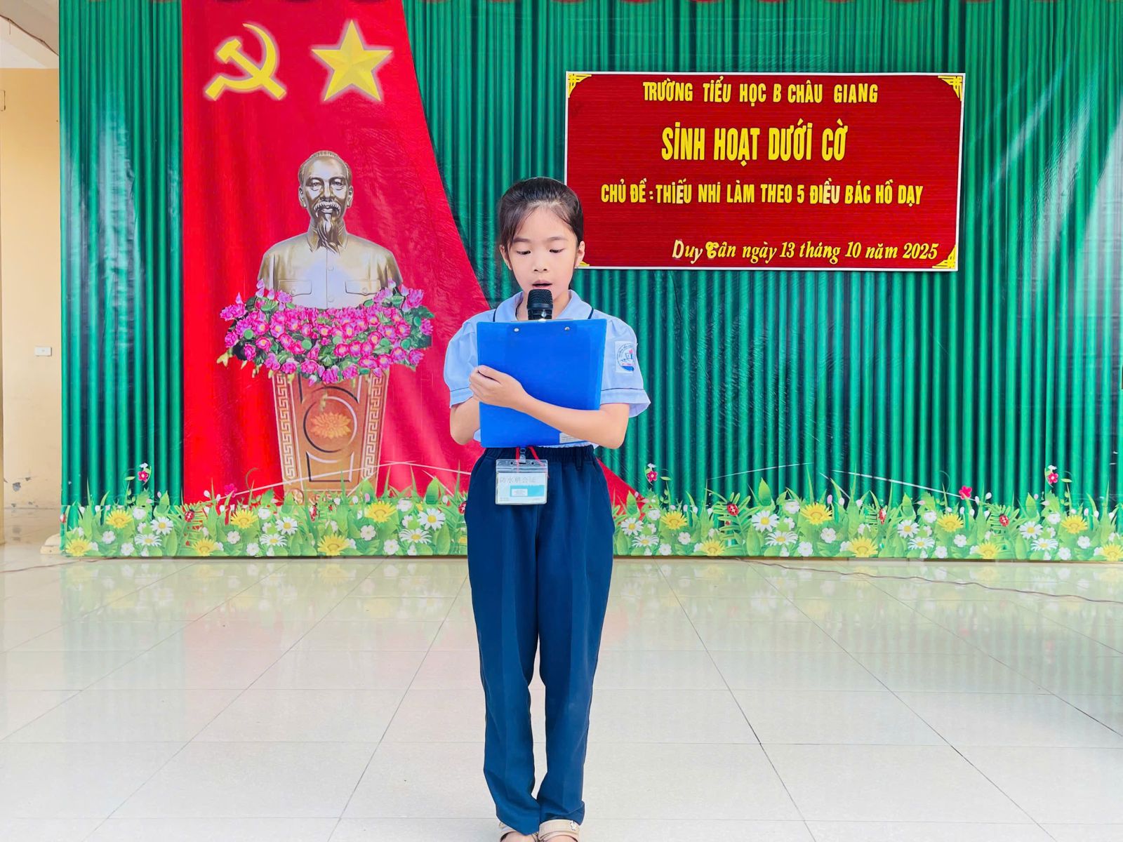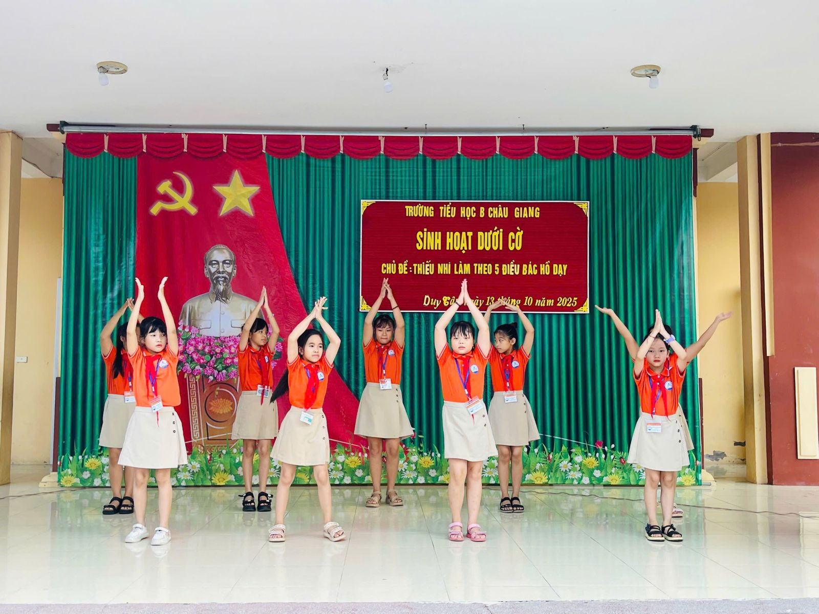 Thực hiện Kế hoạch giáo dục năm học 2025-2026; sáng ngày 13 tháng 10 năm 2025, Trường Tiểu học B Châu Giang tổ chức Sinh hoạt dưới cờ với chủ điểm: “Thiếu nhi làm theo 5 điều Bác Hồ dạy”. Buổi sinh hoạt diễn ra trong không khí vui tươi, trang nghiêm và xúc động.