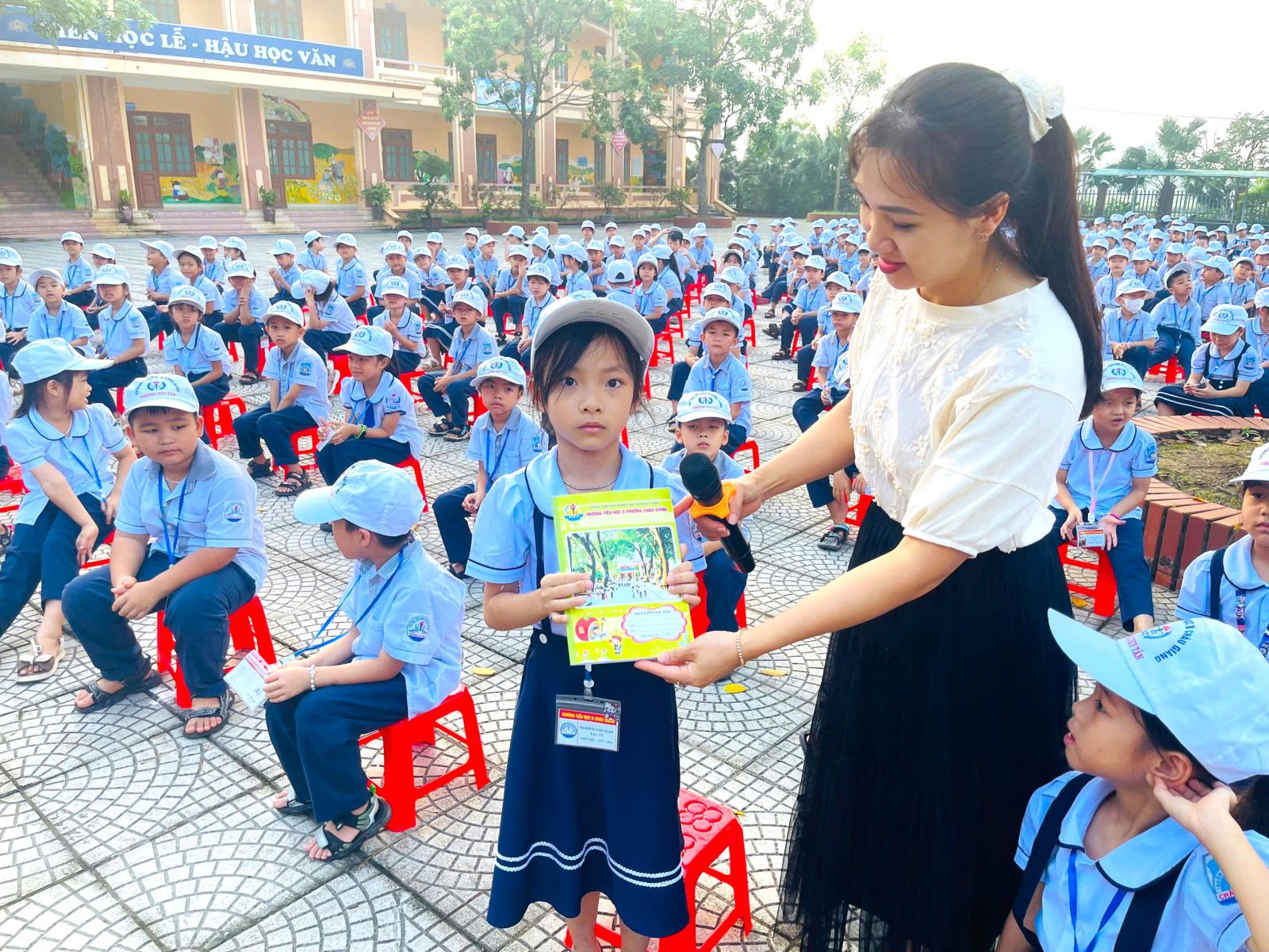 Em Đỗ Thị Ngọc Ánh – HS lớp 5A thay mặt hơn 800 bạn học sinh hứa sẽ thực hiện tốt 5 điều Bác dạy để trở thành “Con ngoan, trò giỏi, cháu ngoan Bác Hồ”.
